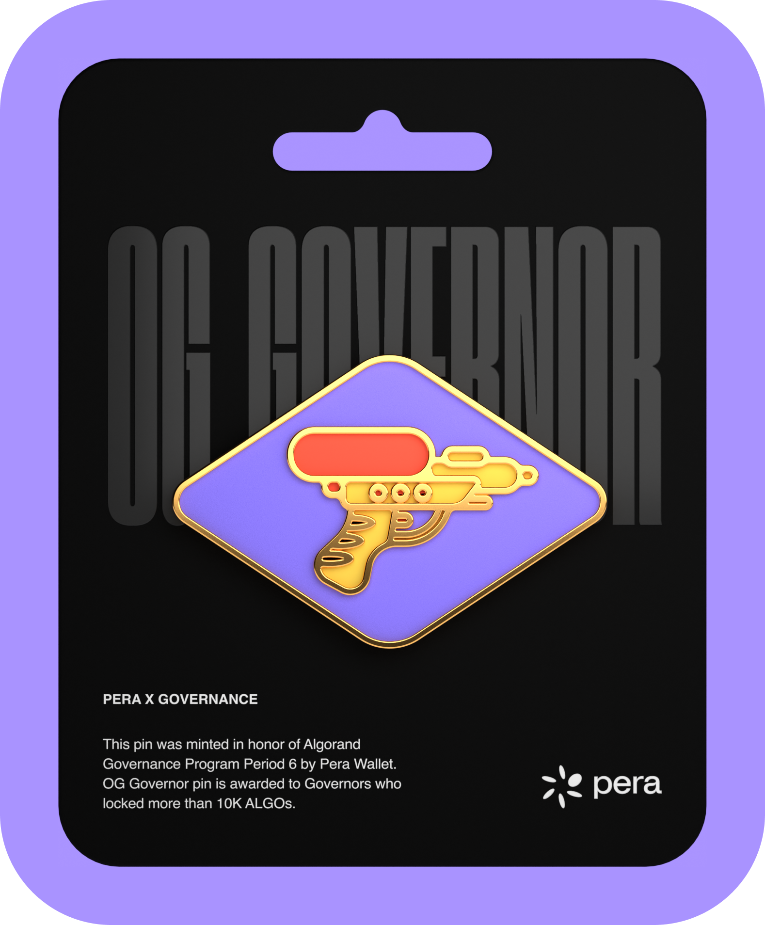 OG Governor - This special edition NFT was minted in honour of Algorand Governance Period 6 participants. OG Governor badge proves that the account staked 10K+ Algo in the governance program. Keep this badge in your Pera Wallet to have access to future perks.